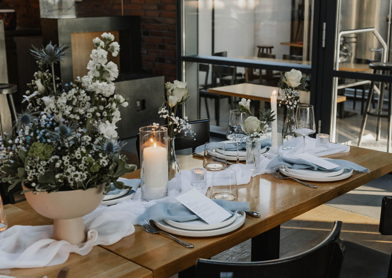Unsere Tischdekoration entführt Sie in eine himmlische Welt aus Eleganz und verspielter Leichtigkeit. Zarte weiße und himmelblaue Nuancen verschmelzen zu einem harmonischen Gesamtbild, das luftig und stilvoll zugleich wirkt. Filigrane Glasvasen mit sanft duftenden Blüten in Weiß und Blau setzen feine Akzente, während flackernde Kerzen ein warmes, verträumtes Licht zaubern. Hochwertige Stoffservietten in sanften Blautönen und edle Details in Silber oder Perlmutt verleihen dem Arrangement eine exklusive Note. Die liebevoll abgestimmte Dekoration schafft eine Atmosphäre, die an schwebende Wolken erinnert – elegant, leicht und einfach zum Träumen schön.
